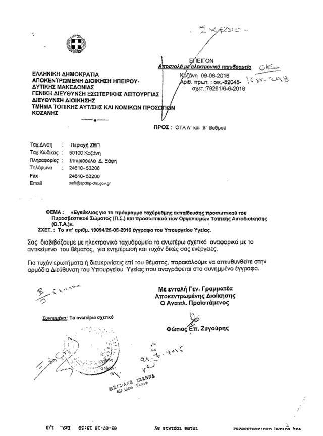 Κύριε Δήμαρχε το ποιον διακατέχει η κομματική λογική είναι γνωστό στους πολίτες της Δεσκάτης. Εξάλλου εσύ επέλεξες τον δρόμο του διχασμού υπηρετώντας,  πάνω από το συμφέρον των δημοτών, την ΚΟΜΜΑΤΙΚΗ ΣΟΥ ΓΡΑΜΜΗ και την λογική της ΑΝΤΙΠΟΛΙΤΕΥΣΗΣ και όχι εγώ, που αναγκάστηκα να απαντήσω. Όσον αφορά για το ψήφισμα του δημοτικού συμβουλίου, έγινε, αφού πολύ πριν σε είχα ενημερώσει ότι είχα αναλάβει νομοθετική πρωτοβουλία για την ψήφιση του σχετικού άρθρου, για τους εθελοντές οδηγούς ασθενοφόρων και σου είχα πει να κάνεις τις σχετικές επαφές για να υπάρξει η εκδήλωση ενδιαφέροντος, ενέργειες τις οποίες προφανώς δεν έκανες. Αναφέρεσαι, όπως και κάποιοι άλλοι, για το αποτέλεσμα της κίνησής σου, για το έγγραφο που σου έστειλε η 3η ΥΠΕ στις 03/08/2016, το οποίο, όμως, είναι το δεύτερο έγγραφο ενημέρωσής σου. Γιατί προφανώς εσκεμμένα αποκρύπτεις από τους συμπολίτες μας, ότι το πρώτο έγγραφο ενημέρωσής σου, ήρθε στο Δήμο από την Αποκεντρωμένη Διοίκηση Ηπείρου-Δυτικής Μακεδονίας, σχεδόν ΔΥΟ ΜΗΝΕΣ πριν, και συγκεκριμένα στις 09/06/2016 με αριθ. πρωτ. 82045 με θέμα: «Εγκύκλιος για το πρόγραμμα ταχύρυθμης εκπαίδευσης προσωπικού του Πυροσβεστικού Σώματος (Π.Σ.) και προσωπικού  των Οργανισμών Τοπικής Αυτοδιοίκησης (Ο.Τ.Α.)» με σχετικό έγγραφο του ΕΚΑΒ  το υπ΄αριθμ. 19094/25-05-2016, το οποίο αναφέρει και το αναλυτικό ωρολόγιο πρόγραμμα της ταχύρυθμης εκπαίδευσης. Παραθέτω το έγγραφο με το οποίο καταρρίπτεται ο ισχυρισμός σου ότι ο νόμος είναι ανεφάρμοστος.
