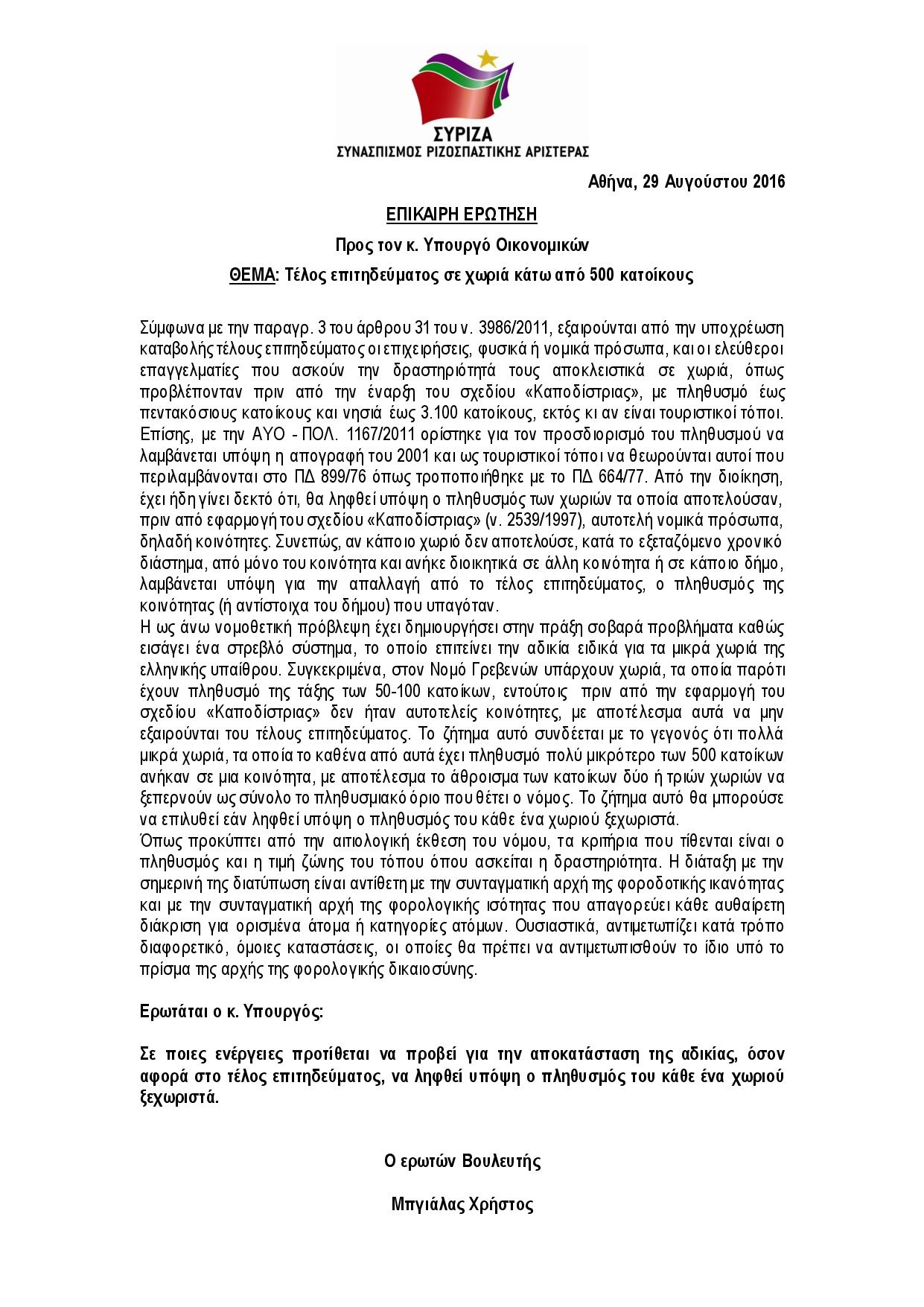 Ο Βουλευτής Γρεβενών Χρήστος Μπγιάλας κατέθεσε επίκαιρη ερώτηση με θέμα «Τέλος επιτηδεύματος σε χωριά κάτω από 500 κατοίκους» προς τον αναπληρωτή υπουργό Οικονομικών κ. Tρύφωνα Αλεξιάδη, η οποία συζητήθηκε την Πέμπτη 01/09/2016 στην αίθουσα της Ολομέλειας της Βουλής.