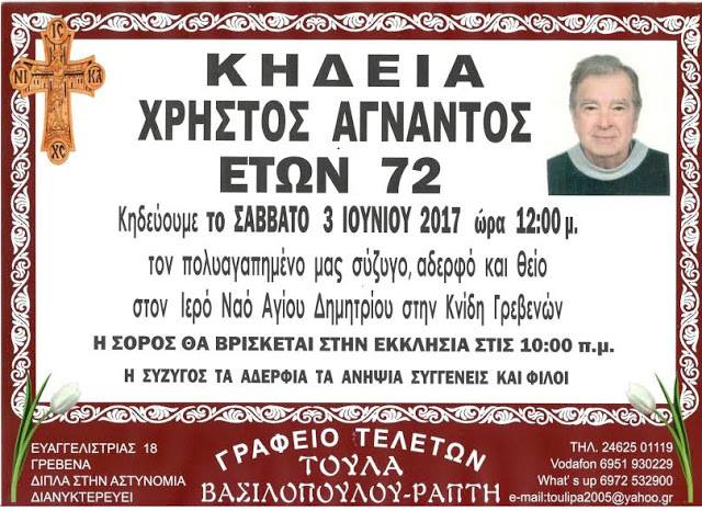 Έφυγε σήμερα από κοντά μας ο Χρήστος Αγνάντος σε ηλικία 72 ετών, η κηδεία του θα πραγματοποιηθεί το Σάββατο 3 Ιουνίου 12.00 μμ. στον Ιερό Ναό Αγίου Δημητρίου στην Κνίδη Γρεβενών από όπου καταγόταν ο γνωστός μουσικός. Θα τον θυμόμαστε όλοι μέσα από τα τραγούδια του. Καλό ταξίδι Χρήστο.