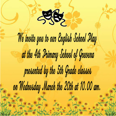 Οι Εκπαιδευτικοί και οι μαθητές της Ε΄Τάξης του 4ου Δημοτικού Σχολείου Γρεβενών σας προσκαλούν την ΤΕΤΑΡΤΗ 20 ΜΑΡΤΙΟΥ 2013 και ώρα 10:00 π.μ. στην αίθουσα εκδηλώσεων του Σχολείου, στην πρωτότυπη θεατρική παράσταση στην αγγλική γλώσσα με θέματα:...