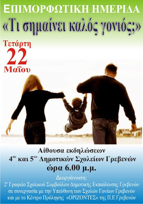 2013 και ώρα 6.00 μ.μ., στην αίθουσα εκδηλώσεων του 4ου και 5ου Δημοτικών Σχολείων Γρεβενών, με θέμα: «Τι σημαίνει καλός γονιός;», σύμφωνα με το παρακάτω πρόγραμμα: