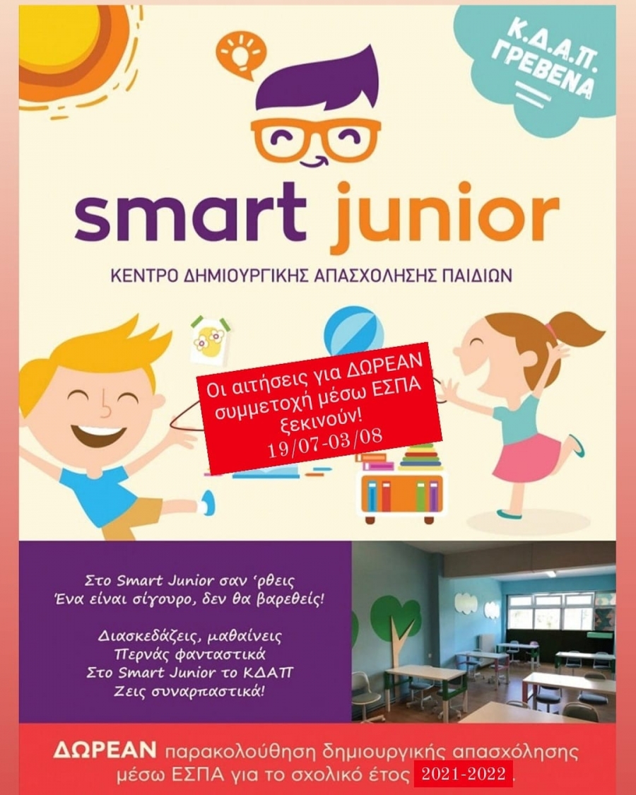 το ΚΔΑΠ Smart Junior είναι μια πιστοποιημένη από το κράτος εκπαιδευτική δομή όπου σκοπός της είναι η δημιουργική αξιοποίηση του ελεύθερου χρόνου των παιδιών ηλικίας 5-12 χρόνων μετά το τέλος της σχολικής διαδικασίας καθώς επίσης και η εξυπηρέτηση των εργαζόμενων γονέων και μη.