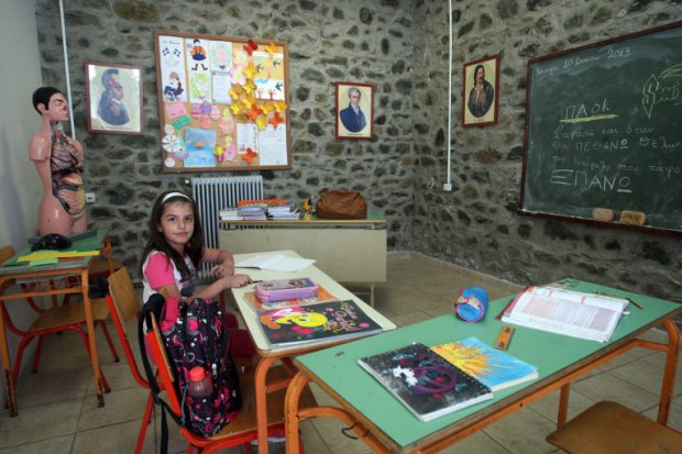 Eight-year-old Kiriaki Tentoglou sits in her small classroom in the village of Feli, in northern Greece. Pictures of famous historical figures adorn the walls.