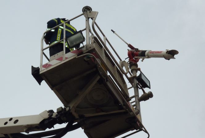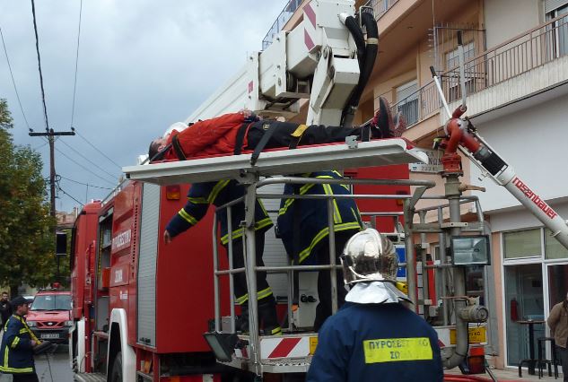 - Στο καλάθι του βραχιονοφόρου οχήματος που έχει φτάσει στο συμβάν προσαρμόζεται το μεταλλικό φορείο, επίσης παίρνεται φορείο τύπου σανίδας και με δύο διασώστες εντός του καλαθιού γίνεται ανάπτυξη έως τον 2ο όροφο. Οι δύο διασώστες μεταπηδούν στο μπαλκόνι όπου διαπιστώνουν ότι το ένα θύμα είναι καλά ενώ το άλλο είναι τραυματισμένο και απαιτείται η μεταφορά του με φορείο. Επίσης ενημερώνονται ότι δεν υπάρχουν άλλοι εγκλωβισμένοι στο φροντιστήριο μέσης εκπαίδευσης. Αναφέρουν τα παραπάνω στον Διοικητή ο οποίος δίνει εντολή για την διάσωση των θυμάτων. Το ένα θύμα που είναι καλά περνά με την βοήθεια των διασωστών στο καλάθι και μεταφέρεται στο έδαφος. Το δεύτερο τραυματισμένο θύμα δένεται πάνω στο φορείο τύπου σανίδας και μεταφέρεται πάνω στο μεταλλικό φορείο του καλαθιού και από εκεί στο έδαφος όπου αναλαμβάνουν οι διασώστες του ΕΚΑΒ.