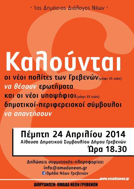 Γι' αυτό λοιπόν καλούμε τους νέους πολίτες (μέχρι 35 ετών) των Γρεβενών να θέσουν ερωτήματα και τους νέους υποψηφίους δημοτικούς και περιφερειακούς συμβούλους (μέχρι 35 ετών) να απαντήσουν. Η εκδήλωση θα λάβει χώρα στην Αίθουσα του Δημοτικού Συμβουλίου του Δήμου των Γρεβενών την Πέμπτη 24 Απριλίου 2014 και ώρα 18:30.