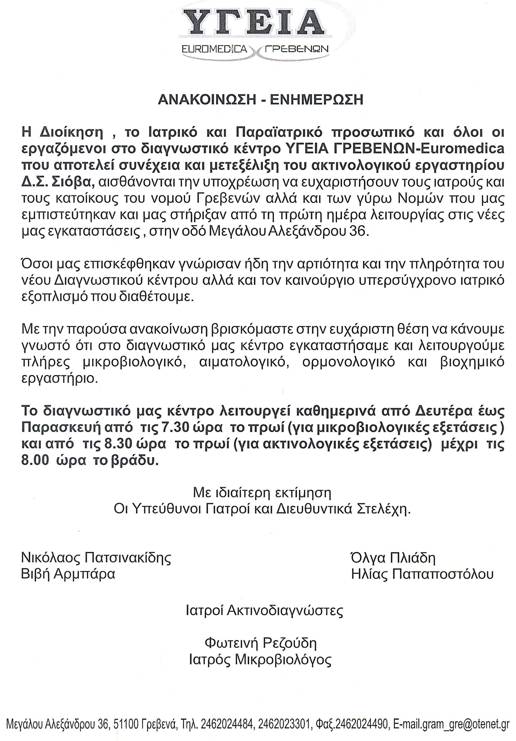 ΥΓΕΙΑ - ΓΡΕΒΕΝΩΝ - EUROMEDICA ΑΝΑΚΟΙΝΩΣΗ - ΕΝΗΜΕΡΩΣΗ