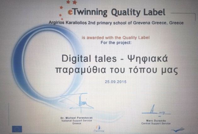 Ψηφιακά παραμύθια του τόπου μας» που  πραγματοποίησε το σχολικό έτος 2014-2015 η Ε΄ τάξη του 2ου Δημοτικού Σχολείου Γρεβενών (σήμερα ΣΤ΄). Ως γνωστό η Ετικέτα Ποιότητας δίνεται σε έργα etwinning (ηλεκτρονικής αδελφοποίησης) που αγγίζουν  την τελειότητα στους ακόλουθους τομείς: