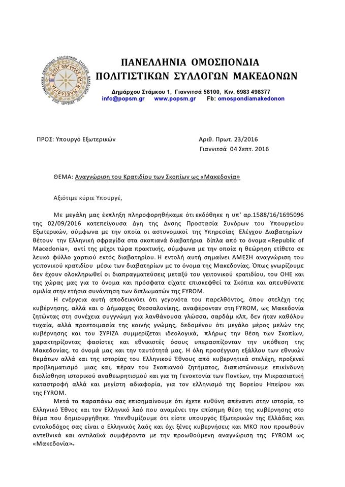 H Πανελλήνια Ομοσπονδία Πολιτιστικών Συλλόγων Μακεδόνων ζητά από το ΥΠΕΞ να ανακαλέσει τη Διαταγή προς τα τελωνεία της χώρας με την οποία, σύμφωνα με το Διεθνές Δίκαιο, ΑΝΑΓΝΩΡΙΖΕΙ το κράτος των Σκοπίων ως ΜΑΚΕΔΟΝΙΑ!