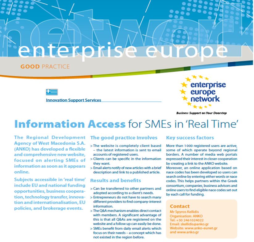 Το Enterprise Europe Network - Hellas    , μέλος του αντίστοιχου πανευρωπαϊκού δικτύου, παρέχει υπηρεσίες διεθνούς επιχειρηματικής συνεργασίας, ενημέρωσης για Ευρωπαϊκές πολιτικές, υπηρεσίες για την καινοτομία και τη μεταφορά τεχνολογίας καθώς και υπηρεσίες για την ενθάρρυνση της συμμετοχής των μικρομεσαίων επιχειρήσεων στα Ευρωπαϊκά προγράμματα για Έρευνα και Τεχνολογία.