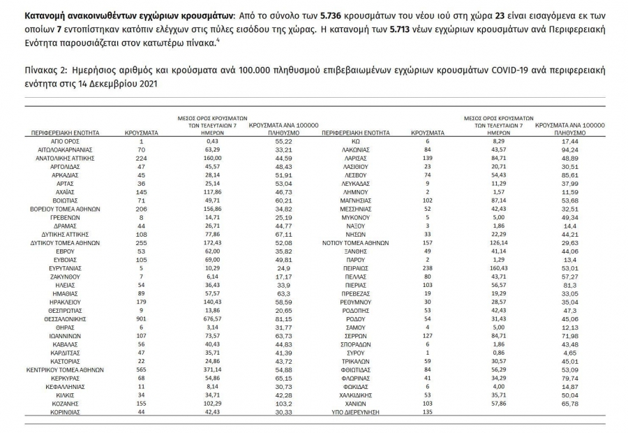 Ανακοινώθηκαν από τον ΕΟΔΥ σήμερα, Τρίτη 14 Δεκεμβρίου 2021, 5.736 νέα κρούσματα κορονοϊού στη χώρα μας απο τα οποία 158 εντοπίστηκαν στην Π.Ε. Κοζάνης, 22 στην Π.Ε. Καστοριάς, 41 στην Π.Ε. Φλώρινας, 8 στην Π.Ε. Γρεβενών.