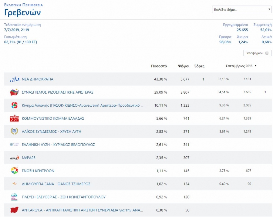 Αποτελέσματα σε 81 από 130 εκλογικά τμήματα των Γρεβενών