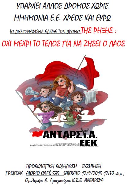 Καλούμε στην ανοιχτή εκδήλωση τους εργαζόμενους, τον κόσμο της επισφάλειας και της ανεργίας, τους νέους, τον κόσμο της αγροτιάς που ωθείται στην καταστροφή, όλες και όλους που μαζί πορευτήκαμε στο δρόμο του αγώνα κατά των μνημονίων και της βάρβαρης πολιτικής ΕΕ-ΕΚΤ-ΔΝΤ και κυβερνήσεων, που μαζί δώσαμε τη νικηφόρα μάχη του περήφανου ταξικού, νεανικού, εργατικού και λαϊκού ΟΧΙ στο δημοψήφισμα, να συμμετέχουν και να συζητήσουμε την πολιτική πρόταση της συμμαχίας ΑΝΤ.ΑΡ.ΣΥ.Α.- Ε.Ε.Κ.- ανένταχτων αριστερών για την εκλογική μάχη και την επόμενη μέρα που έρχεται.
