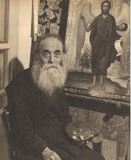 Οι εικόνες του τέμπλου έχουν όλες αγιογραφηθεί στις Καρυές του Αγιου Όρους από τον μοναχό Σεραφείμ. Ο παπα-Σεραφείμ (κατά κόσμον Λάζαρος Οφθαλμόπουλος του Θεοφάνους) κατάγονταν από το χωριό Μουταλάσκη Καππαδοκίας όπου και γεννήθηκε το 1890. Προσήλθε στο Άγιο Όρος το 1907 όπου και πέθανε το 1967. Διέμενε και αγιογραφούσε στο κελί του Αγίου Ιωάννη του Θεολόγου που ανήκε στην Ι.Μ. Μεγίστης Λαύρας (και σήμερα χρησιμοποιείται ως αντιπροσωπείο-κονάκι από το Μοναστήρι στις Καρυές). Στην διπλανή φωτογραφία του 1957 φαίνεται να έχει αγιογραφήσει εικόνα του Προδρόμου, που φέρει τον ίδιο διάκοσμο και την ίδια τεχνοτροπία με τις εικόνες του τέμπλου όπου έχει βάλει και την υπογραφή του. Θεωρείται ένα από τους καλύτερους σύγχρονους αγιογράφους στο Αγιο Όρος.