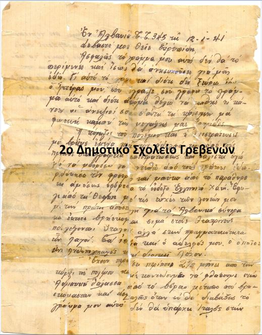 Ασφαλώς το γράμμα μου αυτό δεν θα το περίμενες και ίσως θα ανησυχούσες για μας εδώ. Γι’ αυτό το λόγο και διότι δεν ξεύρω εάν ο πατέρας μου σου έγραψε, σου γράφω το γράμμα αυτό και διότι ακόμα θέλω να μάθης τι κάνουν οι ανιψιοί σου σ’ αυτή την κρίσιμη μα φωτεινή καμπή της μεγάλης μας πατρίδος.