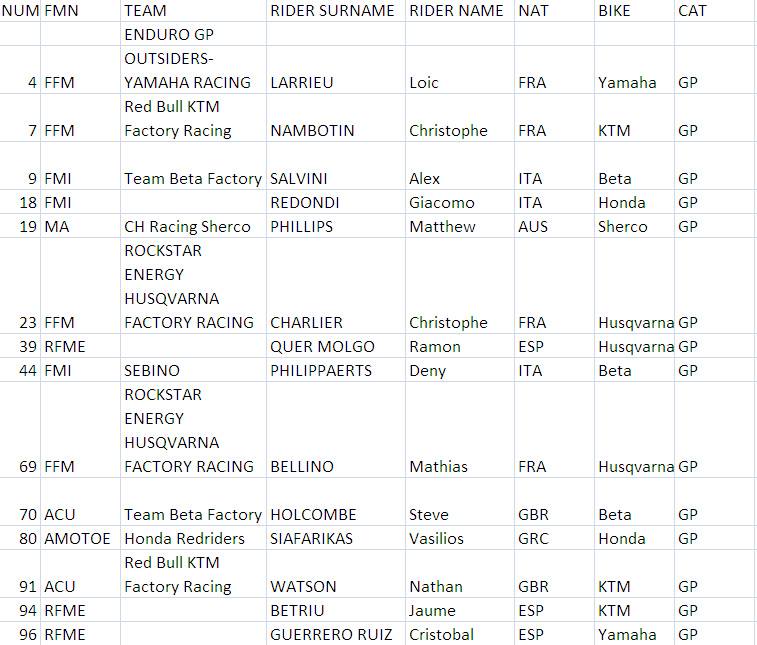 Η λίστα του παγκόσμιου έχει ολοκληρωθεί με 54 αναβάτες να είναι έτοιμοι να χαρίσουν υψηλού επιπέδου θέαμα . Αν και υπάρχουν κάποιοι τραυματισμοί οι κυριότεροι διεκδικητές στις τέσσερις κατηγορίες θα είναι παρόντες με τελευταία προσθήκη τον Γάλλο Mathias Bellino που αν και η αρχική ενημέρωση των έδινε απόντα στο ελληνικό και ουγγρικό gp επιστρέφοντας στην Πορτογαλία ο τραυματισμός του αντικαταστάτη του Antti Hellsten τον υποχρέωσε να γυρίσει πίσω στο πρωτάθλημα .Αδρεναλίνη στο μάξιμουμ από τους μεγάλους αστέρες του χώρου Christophe NAMBOTIN,Nathan WATSON,Steve HOLCOMBE,Loïc LARRIEU,Alex SALVINI,Matthew PHILLIPS και Eero REMES αλλά και από την νεότερη σχόλη Danny και Jamie MCCANNEY,Giacomo REDONDI,Josep GARCIA,Mikael PERSSON ,Davide SORECA με όπλο τους τον ενθουσιασμό έχουν σαν σκοπό να ξεσηκώσουν το κοινό . Σημαιοφόρος των Ελλήνων και μονή ελληνική συμμετοχή στον αγώνα του παγκοσμίου ο Βασίλης Σιαφαρίκας με τους Γιάννη Παυλίδη , Αλέξη Ζώρα,Χρήστο Παπαθεοδώρου , Γιάννη Χασάπη , Λεωνίδα Λεοντιάδη, Χαράλαμπο Δημόπουλο , Χριστόφορο Μελετιάδη , Κωνσταντίνο Σαπαντζή , Χρήστο Κυρτσούδη και Χρήστο Κουρίδη να συμμετέχουν στην κατηγορία National έτοιμοι για μια μεγάλη πρόκληση.