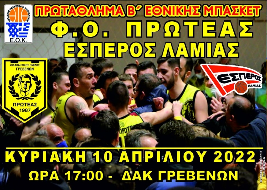 Τον Γ.Σ. Έσπερο Λαμίας θα αντιμετωπίσει η ανδρική ομάδα του Πρωτέα , την Κυριακή 10-4-2022 & ώρα 17:00 στο ΔΑΚ Γρεβενών, στα πλαίσια της 23ης αγωνιστικής του 3ου ομίλου της Β΄ Εθνικής .